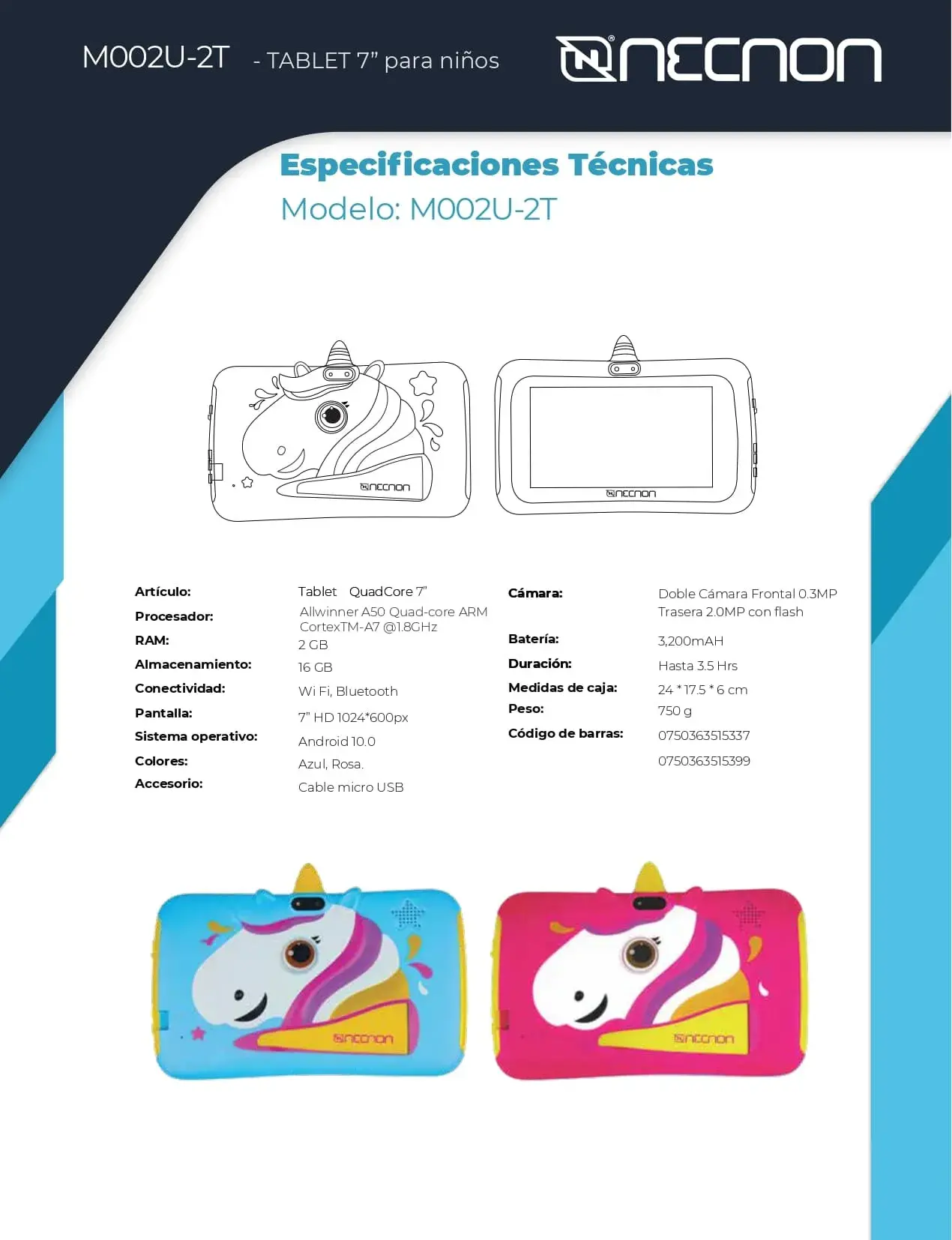 Tablet NECNON M002U-2T-AZ KIDS / 7″ /Android 10 / QUAD CORE ARM / RAM 2GB / Almacenamiento 16GB / FRONTAL 0.3MP, TRASERA 2MP / Bluetooth / Unicornio / Azul