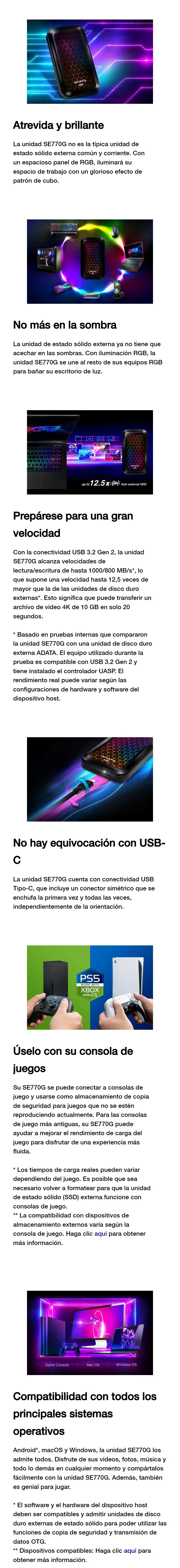 Impulsada por el rendimiento y atrevida. Eso resume la unidad de estado sólido (SSD) externa SE770G. Con velocidades de lectura/escritura de 1000/800 MB/s y compatibilidad con USB3.2 Gen 2 y Tipo-C, esta unidad de estado sólido externa es su dispositivo de almacenamiento ideal para editar vídeos y fotos y jugar en movimiento. Dejando a un lado el rendimiento, la unidad SE770G también deslumbrará con el inconfundible brillo de RGB.