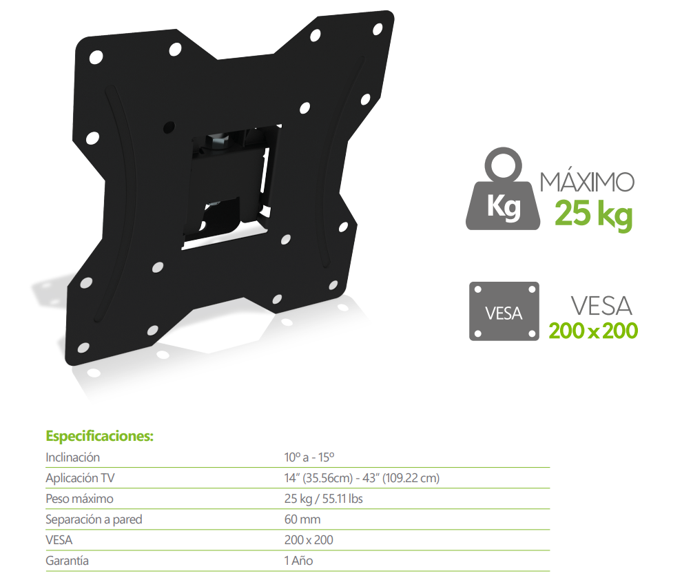 Soporte GHIA Slim STV-17 / Para Pantalla Led-Lcd / 14”- 43” / 25Kg Max / Inclina La Pantalla Hacia Abajo Y Arriba / Negro / STV-17