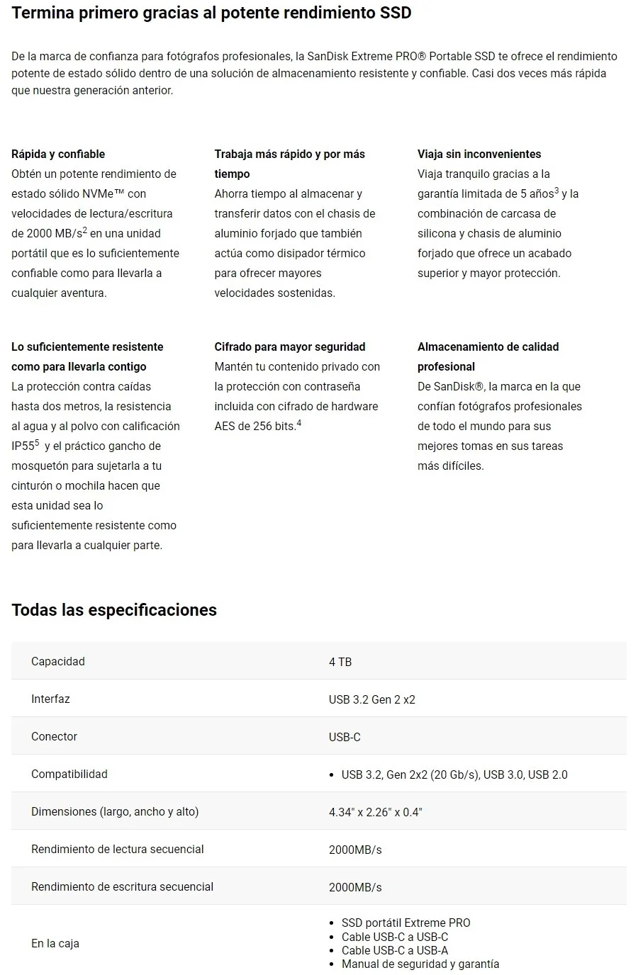 • Ahorra tiempo almacenando y transfiriendo datos con un potente rendimiento de estado sólido NVMe con velocidades de lectura y escritura de hasta 2000 MB/s. Requiere dispositivos compatibles capaces de alcanzar tal velocidad. Basado en pruebas internas; el rendimiento puede ser menor dependiendo del dispositivo host, interfaz, condiciones de uso y otros factores. 1 MB= 1.000.000 bytes.