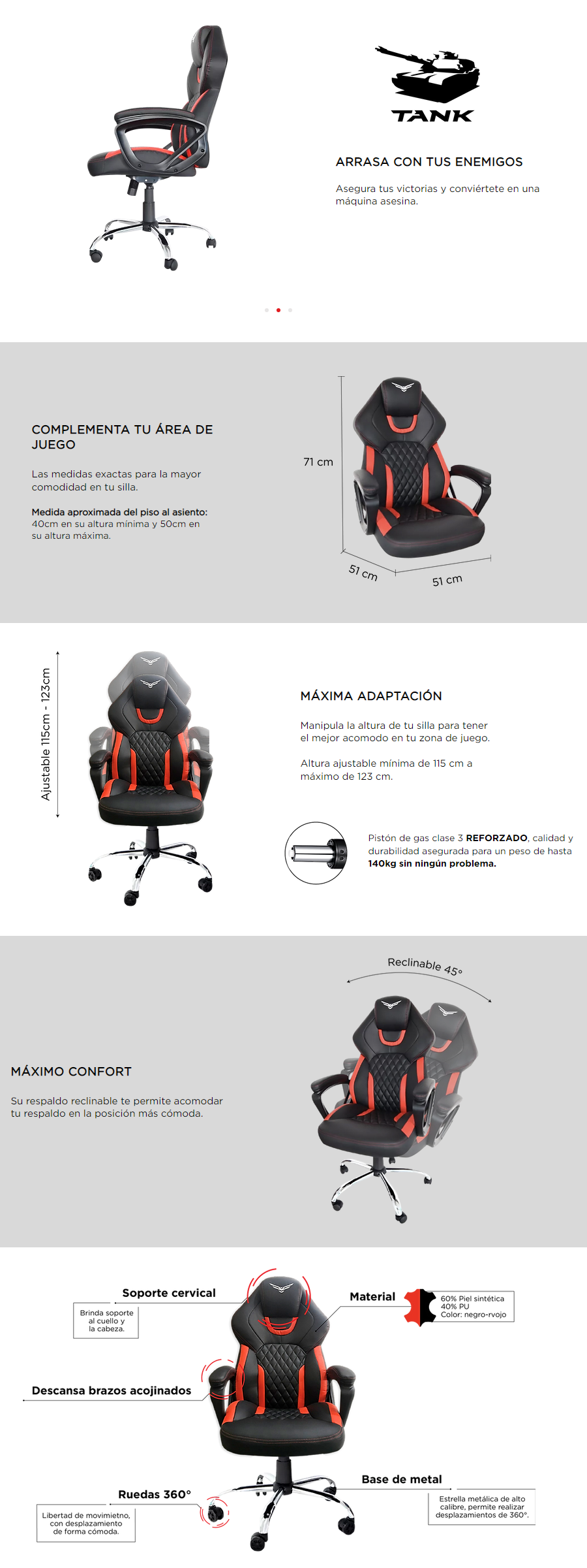 Silla Gamer NACEB TANK / Reclinable 45° / Descansabrazos / Pistón de clase 3 Reforzado / Negro Con Rojo