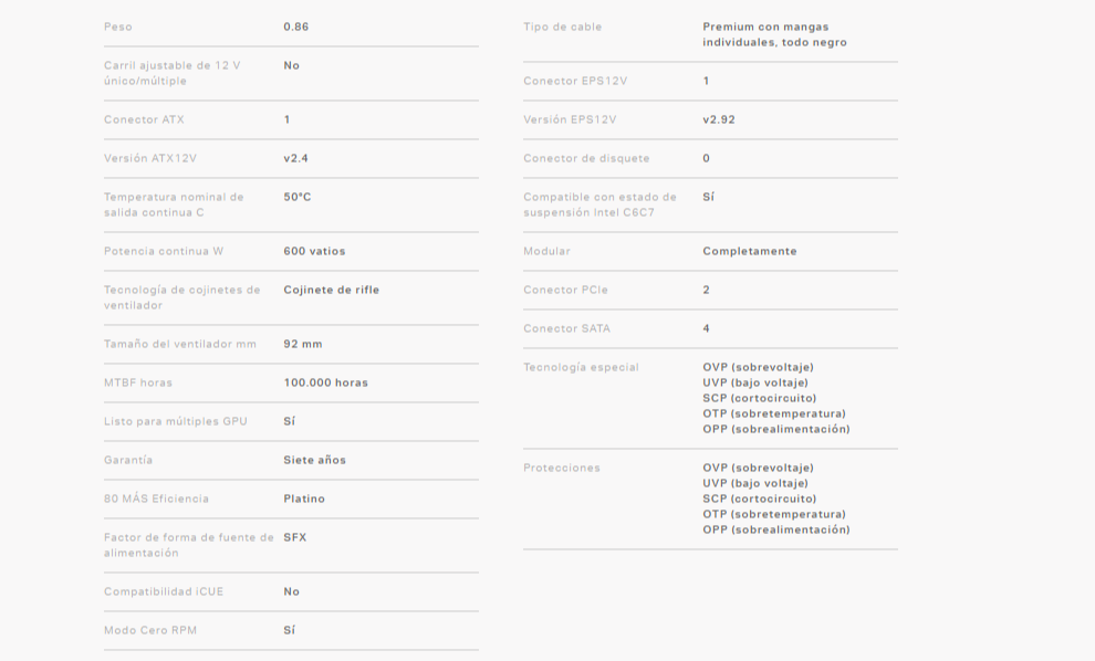 Fuente De Poder CORSAIR SF600 Plus / 600W / 80 Plus Platinum / Modular / ATX 24 Pin / Cpu 4+4 / Pci-E 6+2 / Sata / Molex / Ventilador 92mm / Negro