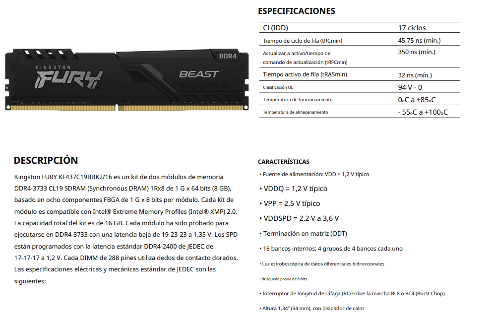 Kingston FURY KF437C19BBK2/16 es un kit de dos módulos de memoria DDR4-3733 CL19 SDRAM (Synchronous DRAM) 1Rx8 de 1 G x 64 bits (8 GB), basado en ocho componentes FBGA de 1 G x 8 bits por módulo.