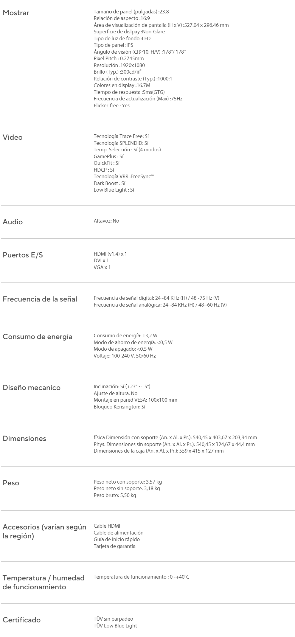 • Pantalla de retroiluminación LED Full HD (1920×1080) de 23.8 pulgadas con panel de ángulo de visión IPS de 178 ° de ancho.