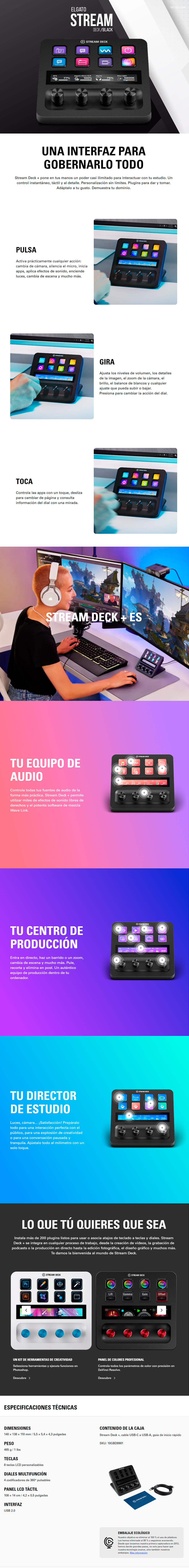 Teclado Para Streaming ELGATO STREAM DECK+ / USB-A 2.0/USB-C / 8 Teclas LCD Configurables + 4 Codificadores 360° Pulsables + Panel LCD Táctil 106X12MM / Altura Ajustable / Negro