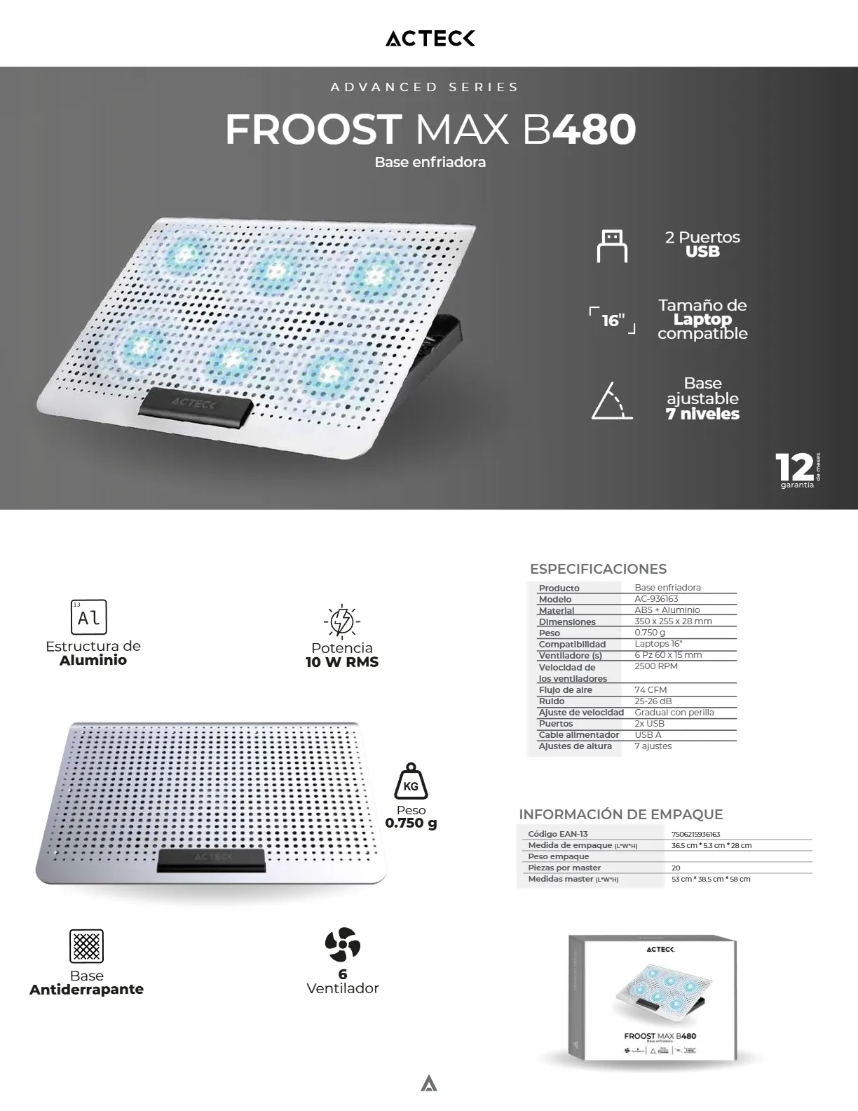 Base Enfriadora ACTECK Froost Max B480 / 2 Puertos USB / 16″ / 7 Niveles / 6 Ventiladores 10w RMS / Aluminio / Antiderrapante / Blanco