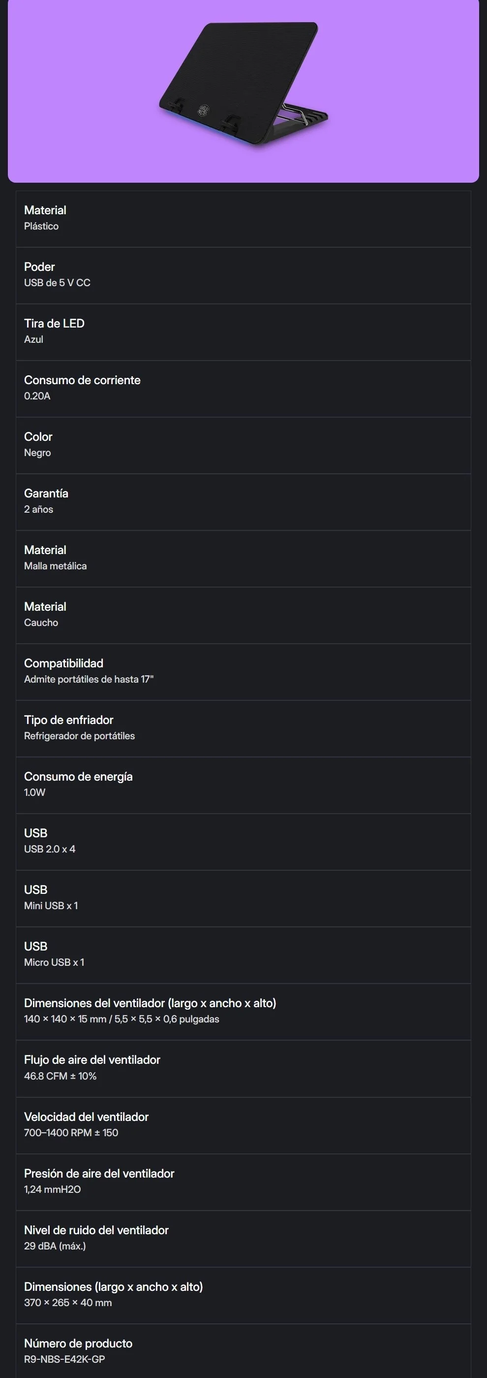 Sé el primero en valorar “Base Enfriadora COOLER MASTER ERGOSTAND IV / 1 Ventilador / USB, Micro USB, Mini USB / Tira De Led Azul / Malla Metálica / Negro”