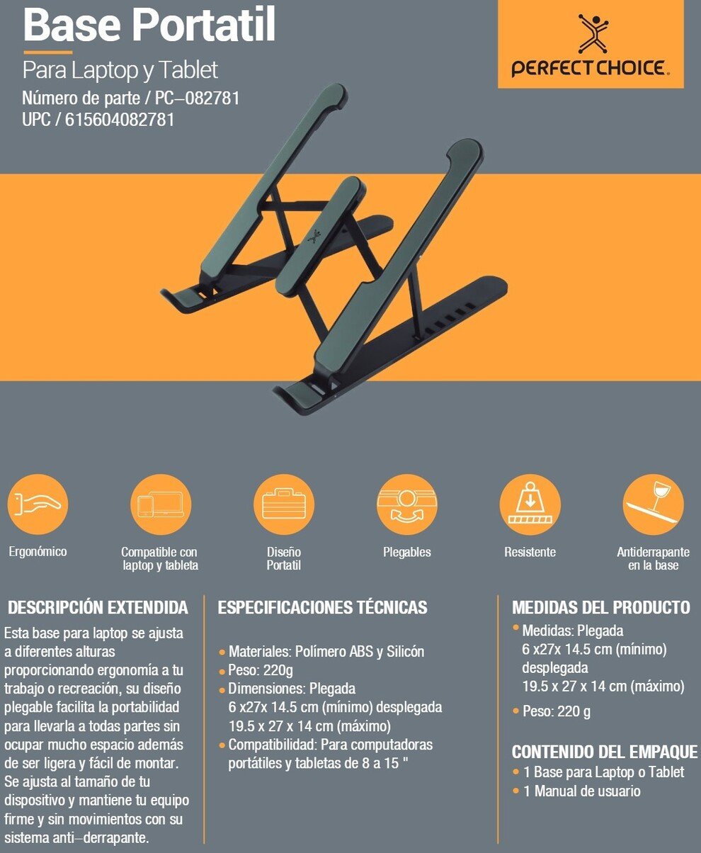 Base Enfriadora PERFECT CHOICE PC-082781 / Hasta 15 Pulgadas / Compatible Con Tablets / Ventilación Natural / Plegable / Altura Ajustable / Material Antiderrapante / Negro