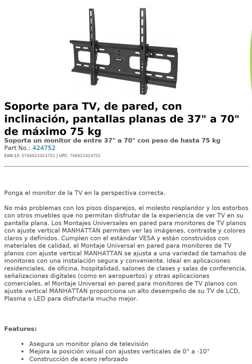 Soporte De Pared MANHATTAN 424752 / 37″ A 70″ / VESA / Hasta 75kg / Articulado / Ajuste De Inclinación / Acero / Con Nivelador / Negro