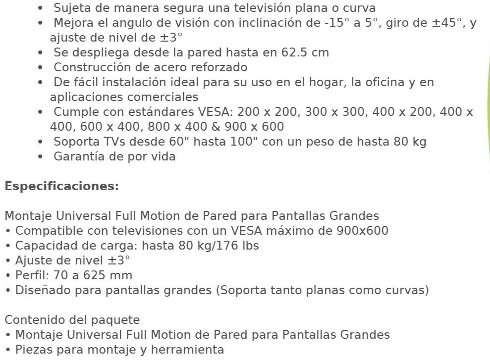 Sé el primero en valorar “Soporte De Pared MANHATTAN 461221 / 60″ A 100″ / VESA / Hasta 80kg / Articulado / Soporta Pantallas Planas Y Curvas / Inclinación / Acero / Negro”