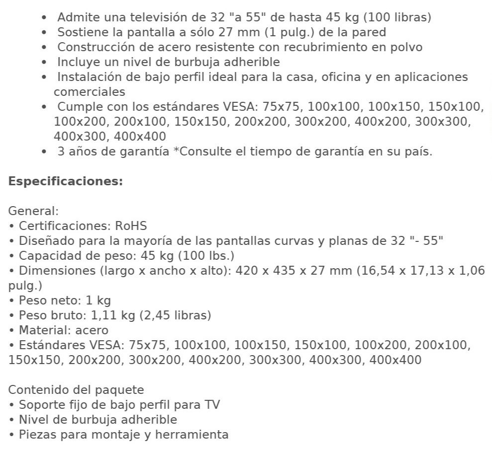 • Admite una televisión de 32 “a 55” de hasta 45 kg (100 libras)
