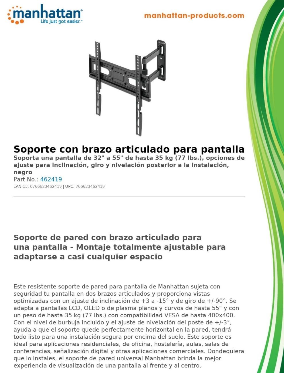 Soporte De Pared MANHATTAN 462419 / Para TV / 32″ A 55″ / VESA / Hasta 35Kg / Articulado / Ajuste De Inclinación / Acero / Negro