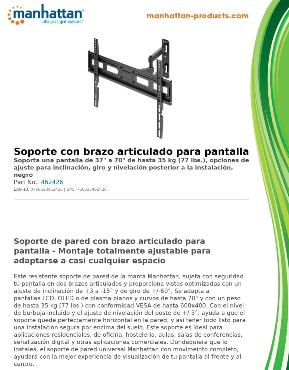 Soporte De Pared MANHATTAN 462426 / 37″ A 70″ / VESA / Hasta 35kg / Articulado / Ajuste De Inclinación, Giro / Acero / Negro