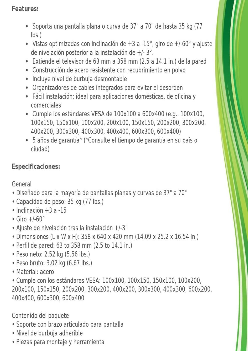 • Soporta una pantalla plana o curva de 37″ a 70″ de hasta 35 kg (77 lbs.)