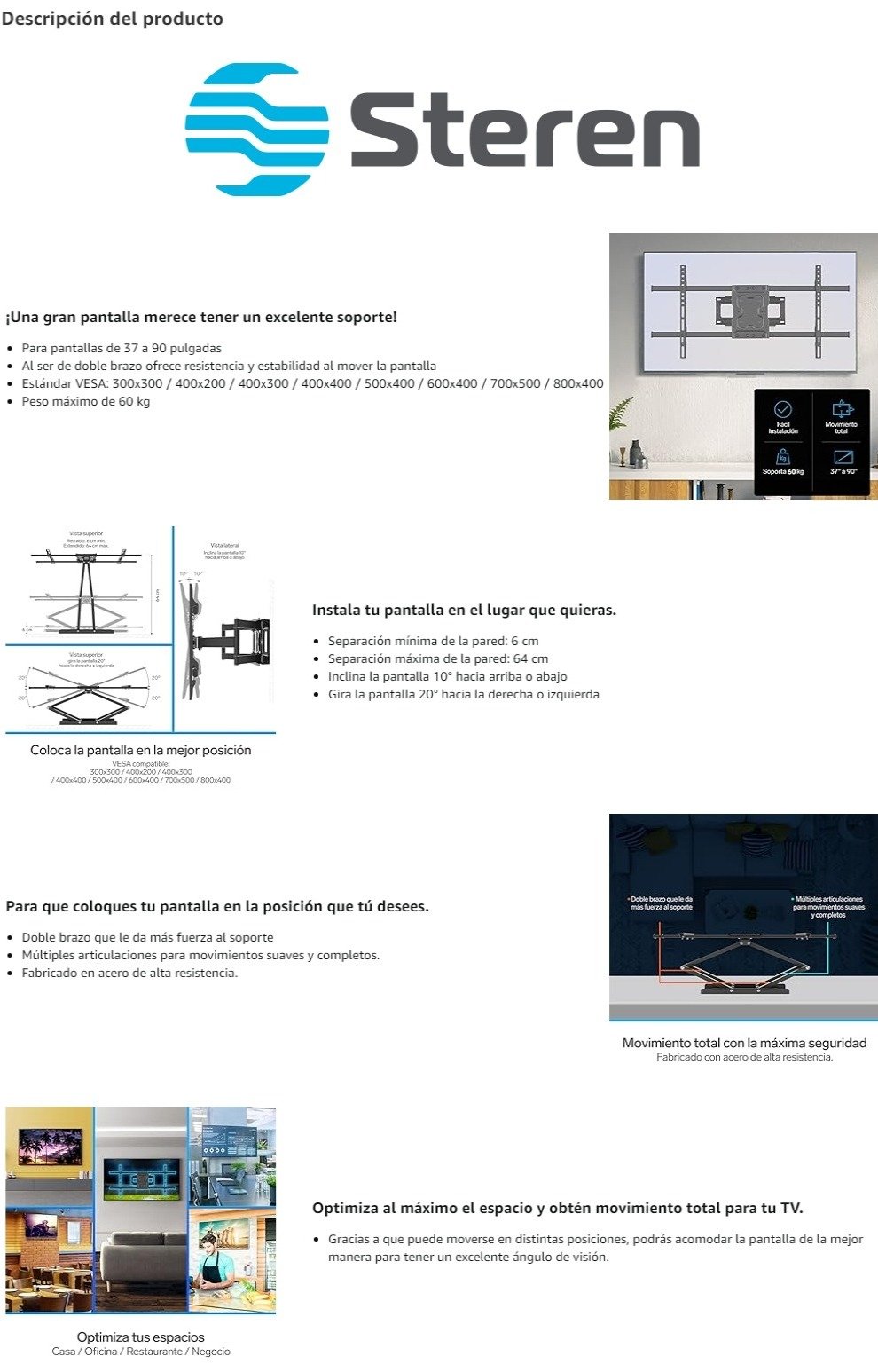 Soporte De Pared STEREN STV-125 / 37″ A 90″ / VESA / Hasta 60kg / Articulado / Ajuste De Inclinación, Giro, Rotación / Acero / Negro