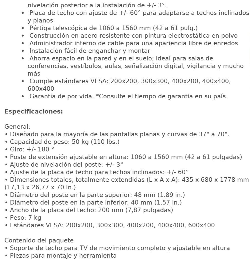 • Soporta un televisor de 37″ a 70″ de hasta 50 kg.