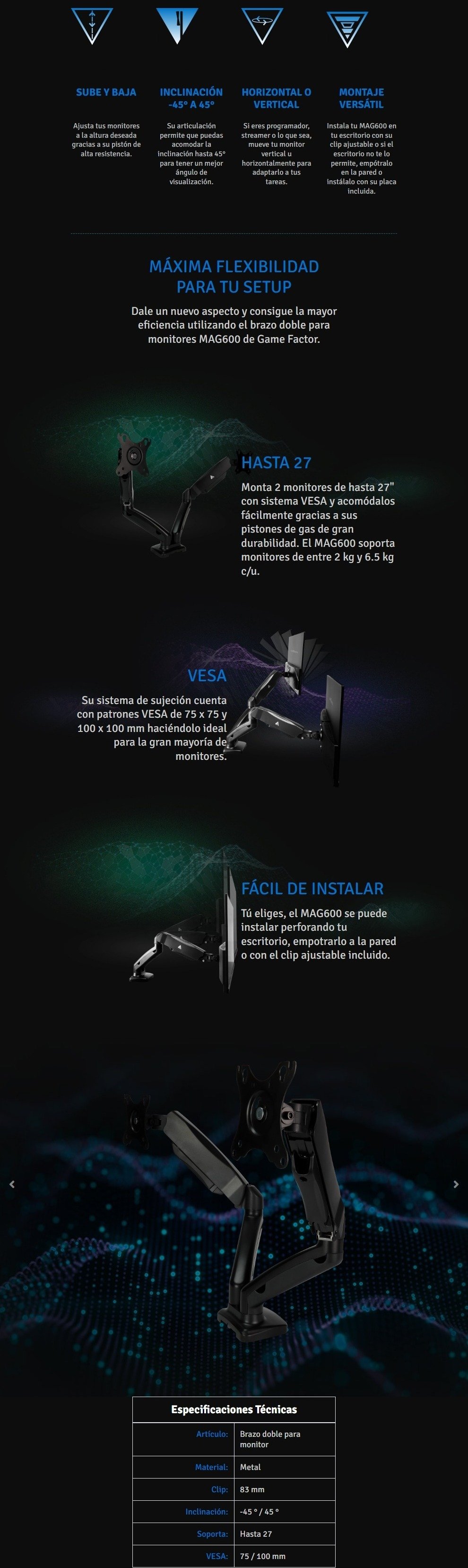 Soporte GAME FACTOR MAG600 / Para 2 Monitores / VESA / Hasta 27 Pulg / Inclinación -45° A 45° / Capacidad 6.5 Kg / Negro