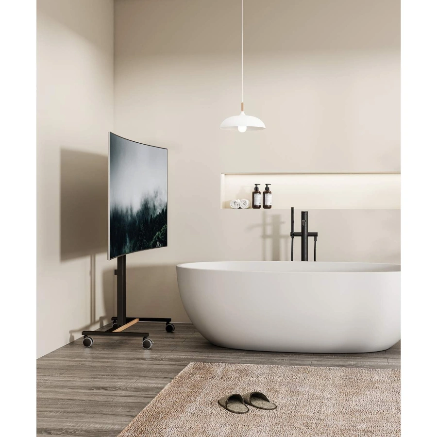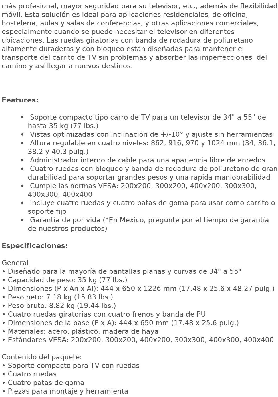 • Soporte compacto tipo carro de TV para un televisor de 34″ a 55″ de hasta 35 kg (77 lbs.)