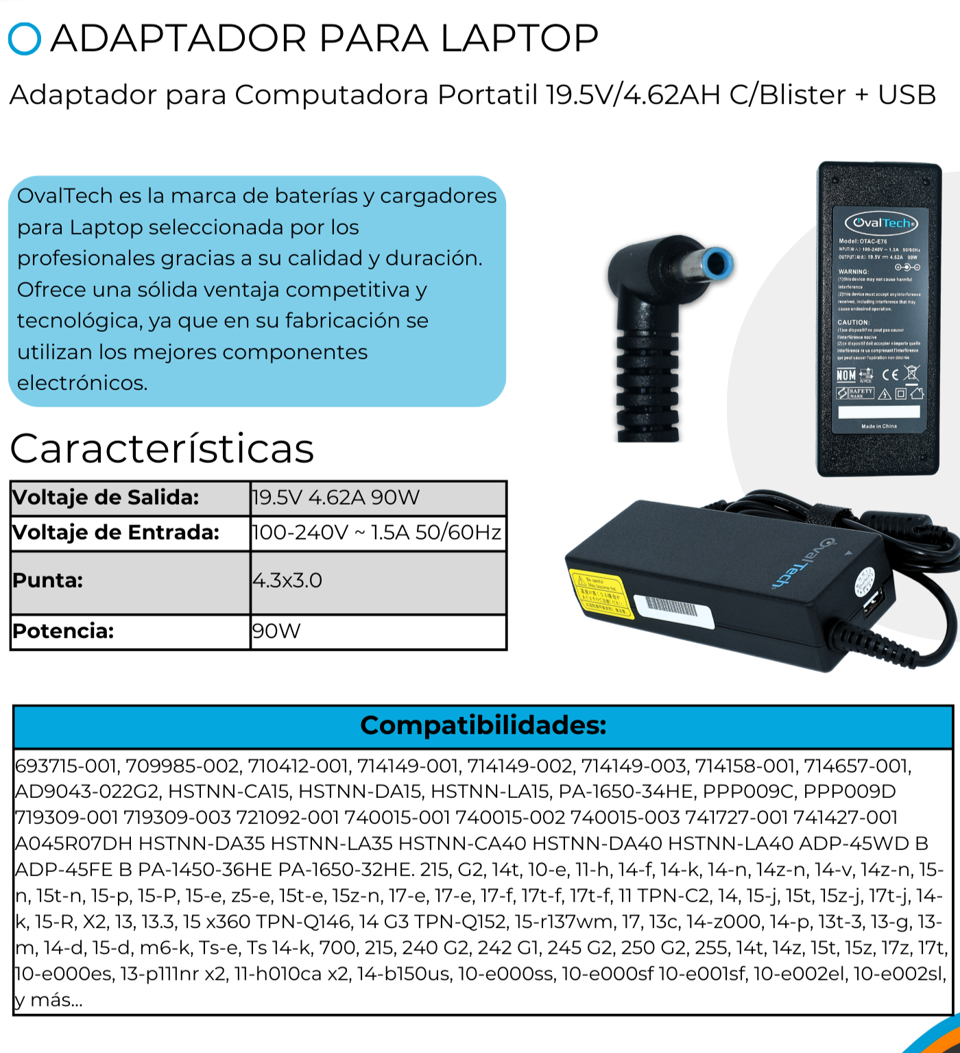 Cargador/Adaptador OVALTECH para Laptop – OTAC-E76, 90W, 19.5V, 4.62A, (4.5*3.0), Punta Azul – Negro