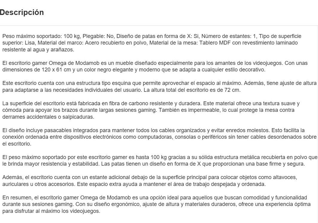 Escritorio Gaming MODAMOB OMEGA / A Prueba de Agua / Hoyos Para Cables / 120X61X72 CM / Negro