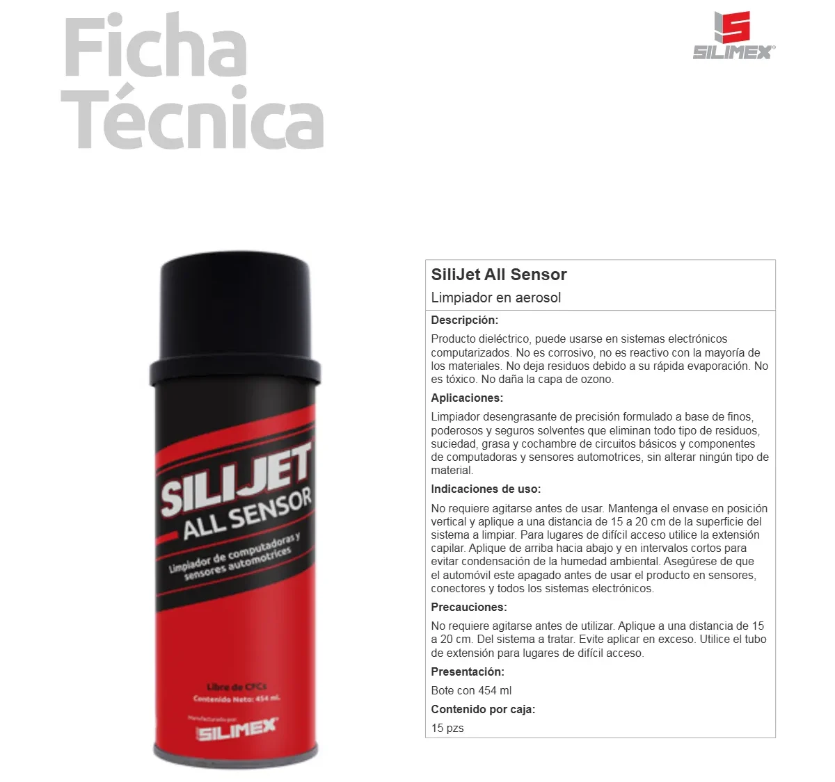 Aerosol SILIJET ALL SENSOR SILIMEX / Desengrasante Dieléctrico De Computadoras Y Sensores Automotrices / 454Ml