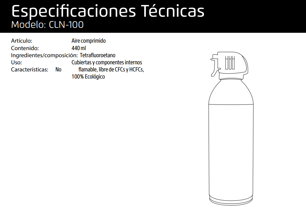El removedor de polvo CLN-100, formulado a base de gases inertes de alta pureza (ultrafiltrados y libres de humedad), envasado en alta presión.