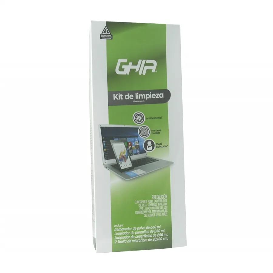 Mantén tus equipos siempre limpios y en la mejor condición con los productos de limpieza ghia. kit completo para mantenimiento y limpieza de tus equipos, contiene: -removedor de polvo de 660ml -loción limpiadora de superficies de 250ml -limpiador de pantallas de 250ml -incluye 2 toallas de microfibra de 30x30cm eliminan grasa y suciedad eliminan huellas dactilares ofrecen protección antiestática protección y antibacterial