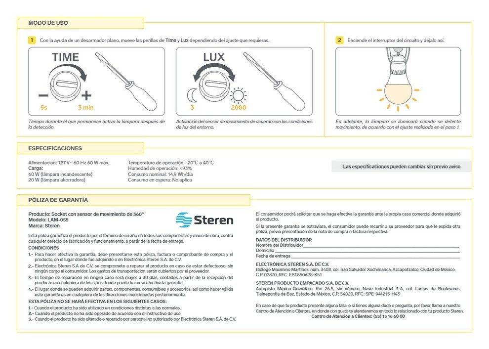 Socket Detector De Movimiento STEREN LAM-055 / Detección De Movimiento 360° / 5s – 3 Min / Detección Máxima 6m / Para Focos Incandescentes Y Ahorradores / E27 / Color Blanco