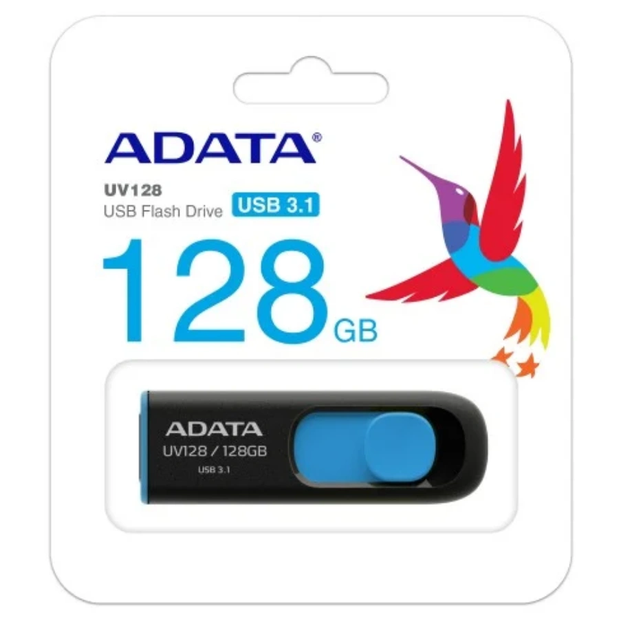 Memoria USB ADATA UV128 / 128GB / USB 3.2 / Deslizante / Negro Con Azul / AUV128-128G-RBE
