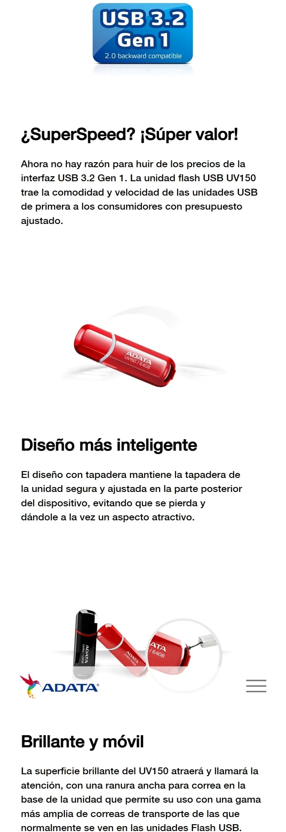 La UV150 combina un aspecto clásico con un precio económico, una interfaz SuperSpeed USB 3.2 Gen 1 y un atractivo exterior perlado. Con colores sorprendentes de escarlata y ónice reluciente, su diseño minimalista y moderno hacen de ella un accesorio de moda y práctico tanto en la ciudad como fuera.