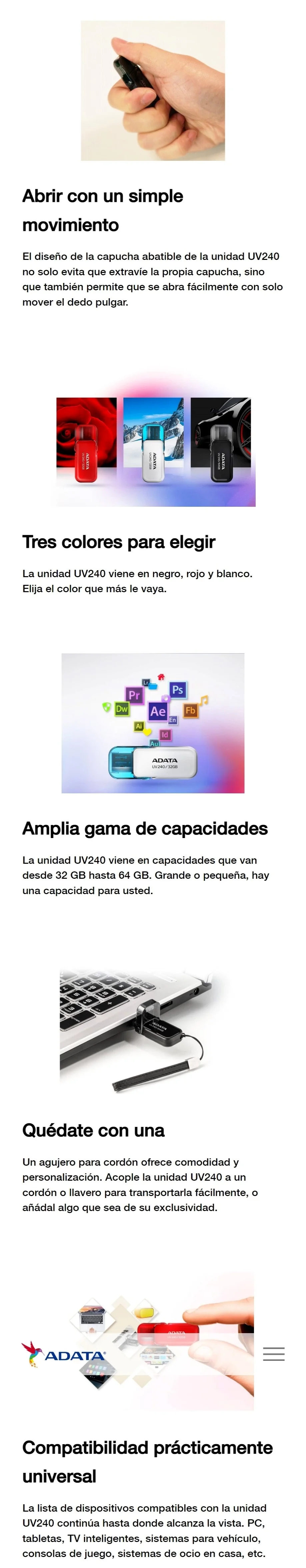 ¿No lo odia cuando pierde la capucha de su unidad USB? No lo odiará más. Presentamos la unidad flash USB ADATA UV240 con una práctica capucha abatible que nunca perderá.