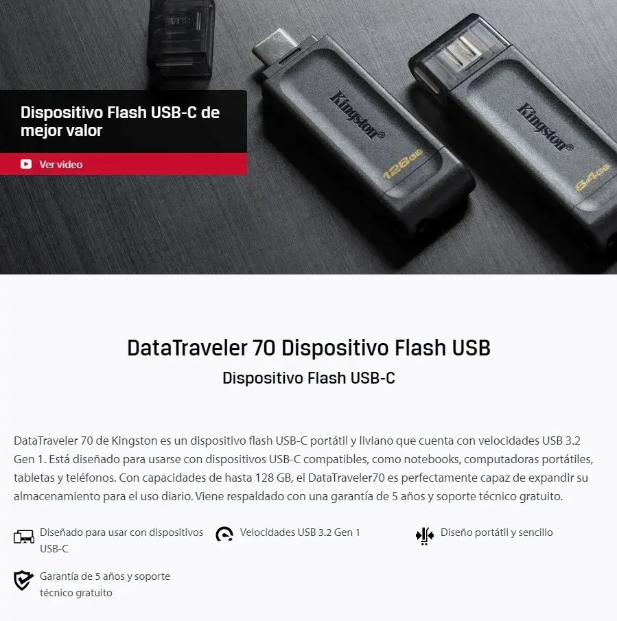 Memoria USB KINGSTON TECHNOLOGY DT70 / 64GB / Interfaz 3.2 / Negro
