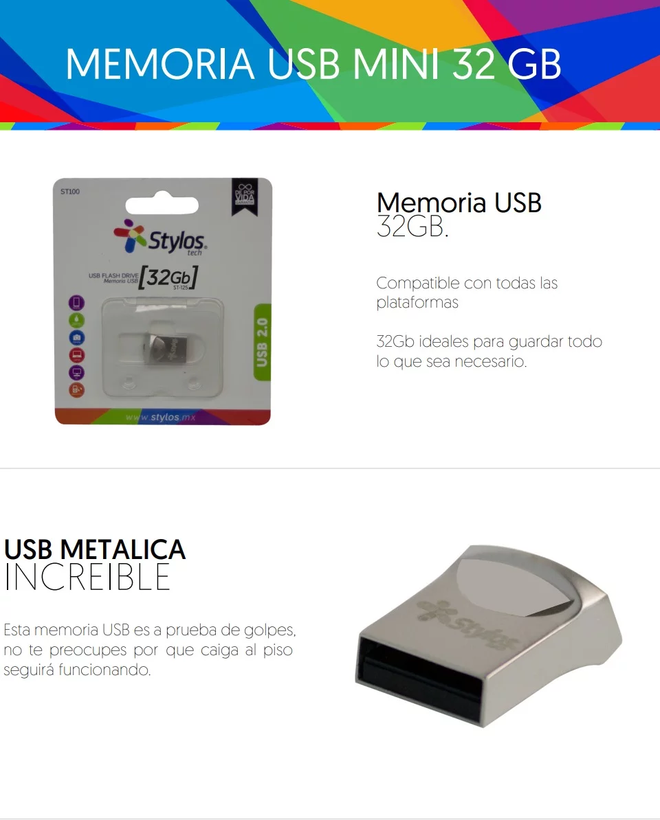 Con tu memoria USB de Stylos podrás guardar los archivos que quieras, no te quedes sin espacio en tus dispositivos, compra un memoria USB STYLOS.