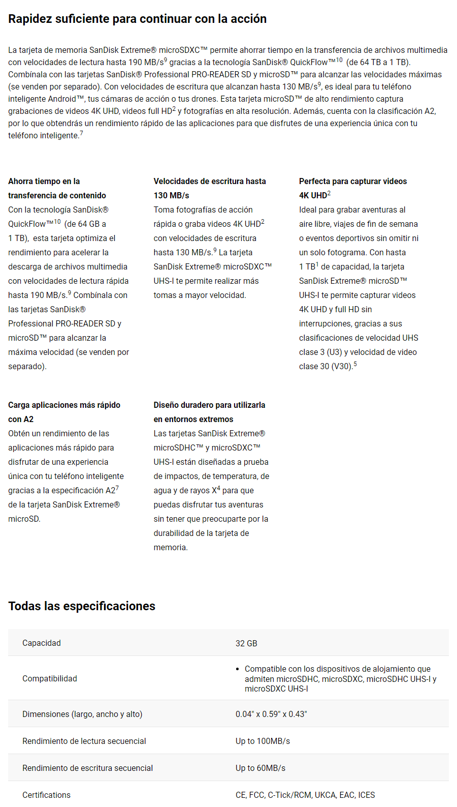 Esta tarjeta microSD™ de alto rendimiento captura grabaciones de videos 4K UHD, videos full HD2 y fotografías en alta resolución.