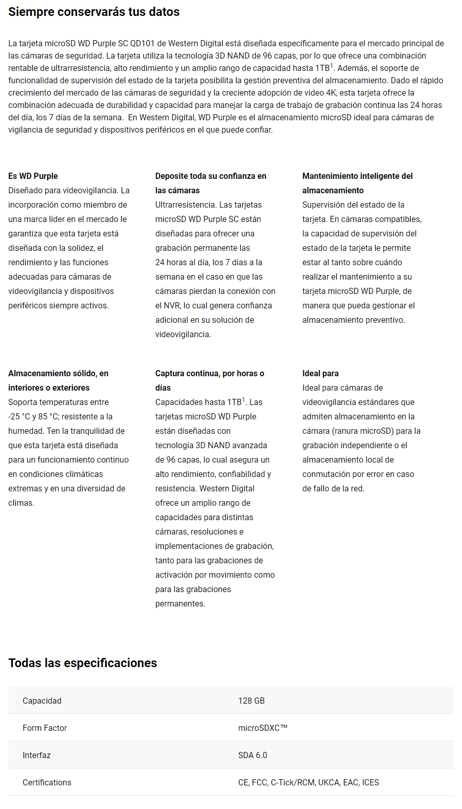 Sé el primero en valorar “Micro SDXC PURPLE SC QD101 Western Digital / 128GB / Clase 10 / Videovigilancia / Morado”