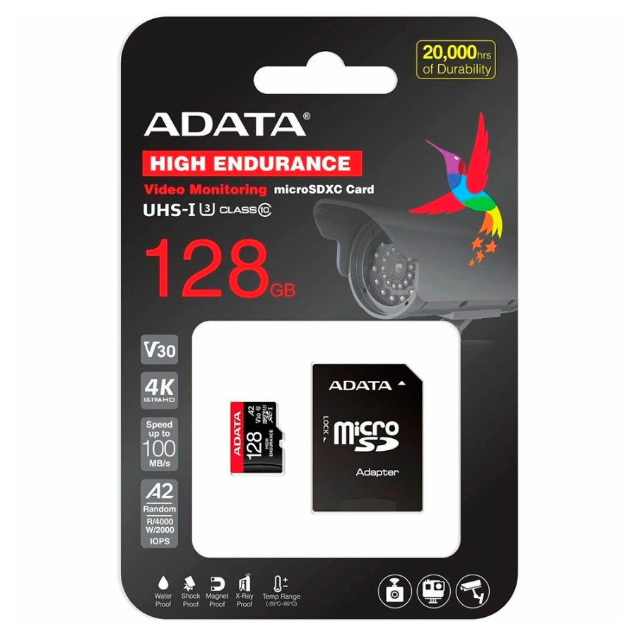 Tarjeta MicroSD ADATA HIGH ENDURANCE / 128GB / Clase 10 / Lectura 100MB/s / Escritura 80MB/s / Con Adaptador / Uso Rudo / UHS-I – Negro