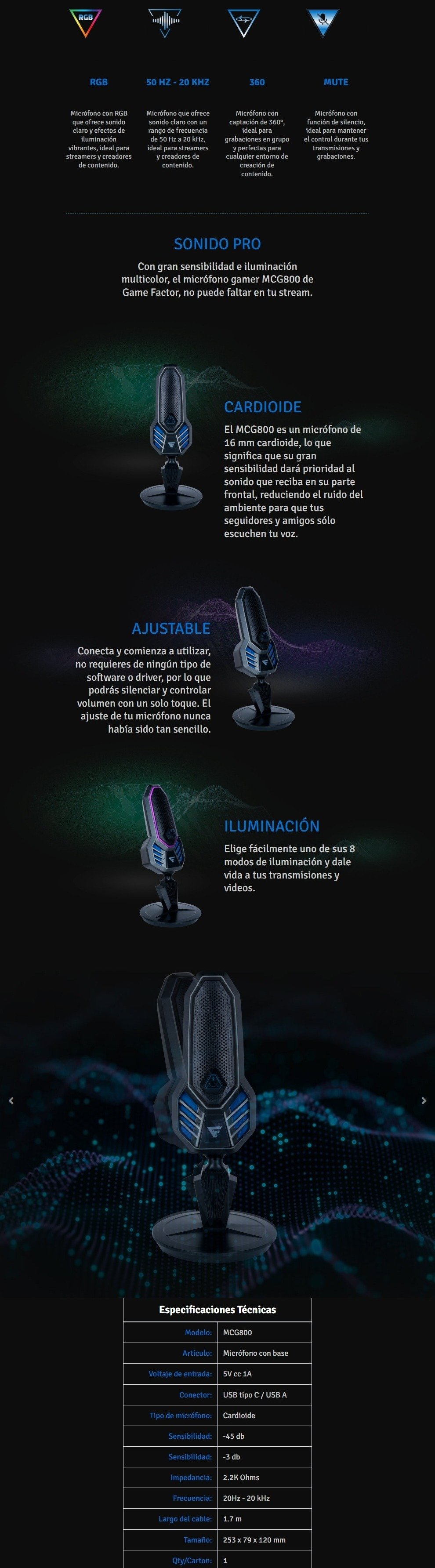 Micrófono Gaming GAMER FACTOR MCG800 / RGB / Alámbrico / USB Tipo C / Incluye Base / Alta Sensibilidad / Negro
