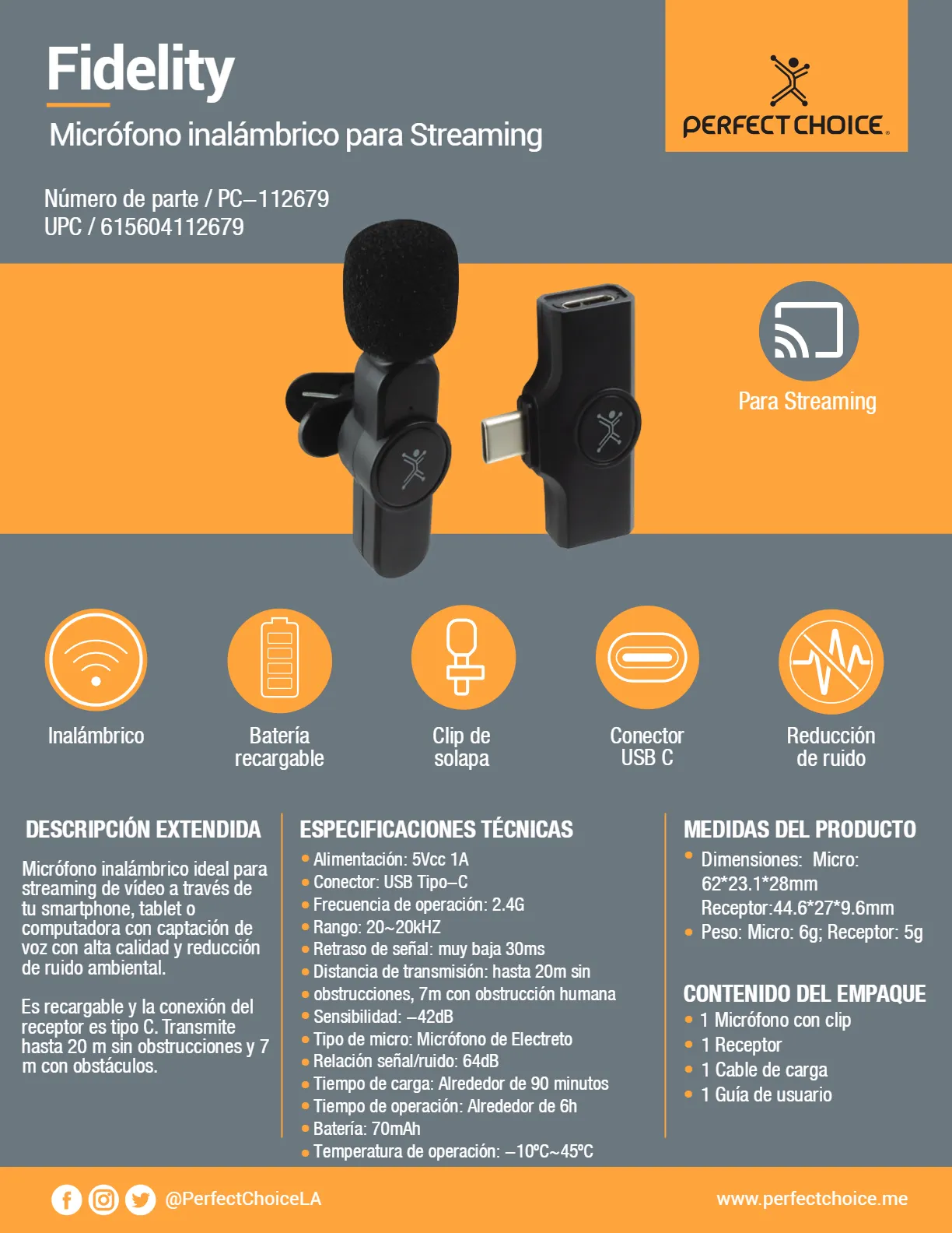 • Presentamos el micrófono inalámbrico de transmisión Fidelity, la herramienta perfecta para la transmisión de vídeo a través de su teléfono inteligente, tableta u computadora.