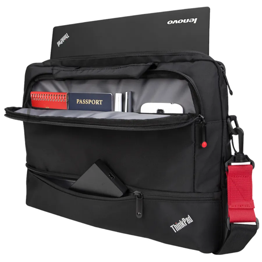 El Essential Topload Case es un estuche funcional y liviano, hecho de nylon duradero y liviano. Este estuche de carga superior tiene un compartimento protector para el portátil para su ThinkPad, tiene mucho espacio de almacenamiento para su fuente de alimentación y otros artículos personales. El estuche también tiene una correa ergonómica para el hombro y asas de transporte acolchadas. La correa del carro fija el estuche al equipaje rodante para facilitar el viaje.