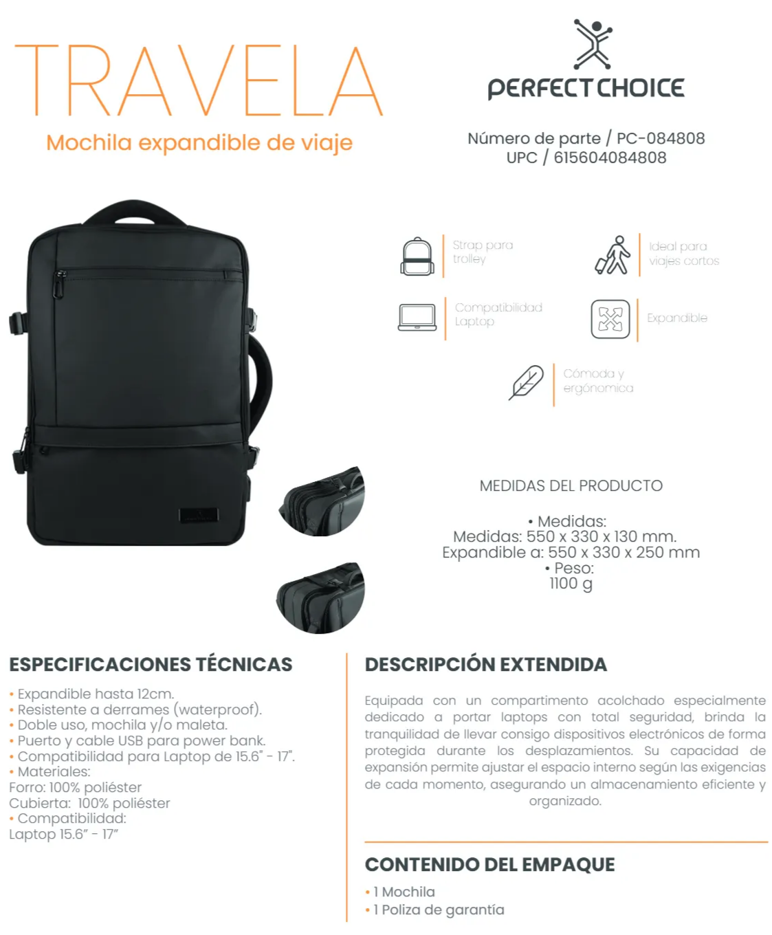 Mochila Expandible PERFECT CHOICE – 15.6” a 17”, Con Sujetador Para Maleta Travela, Para Laptop, Viajes, Escuela, Waterproof – Negro