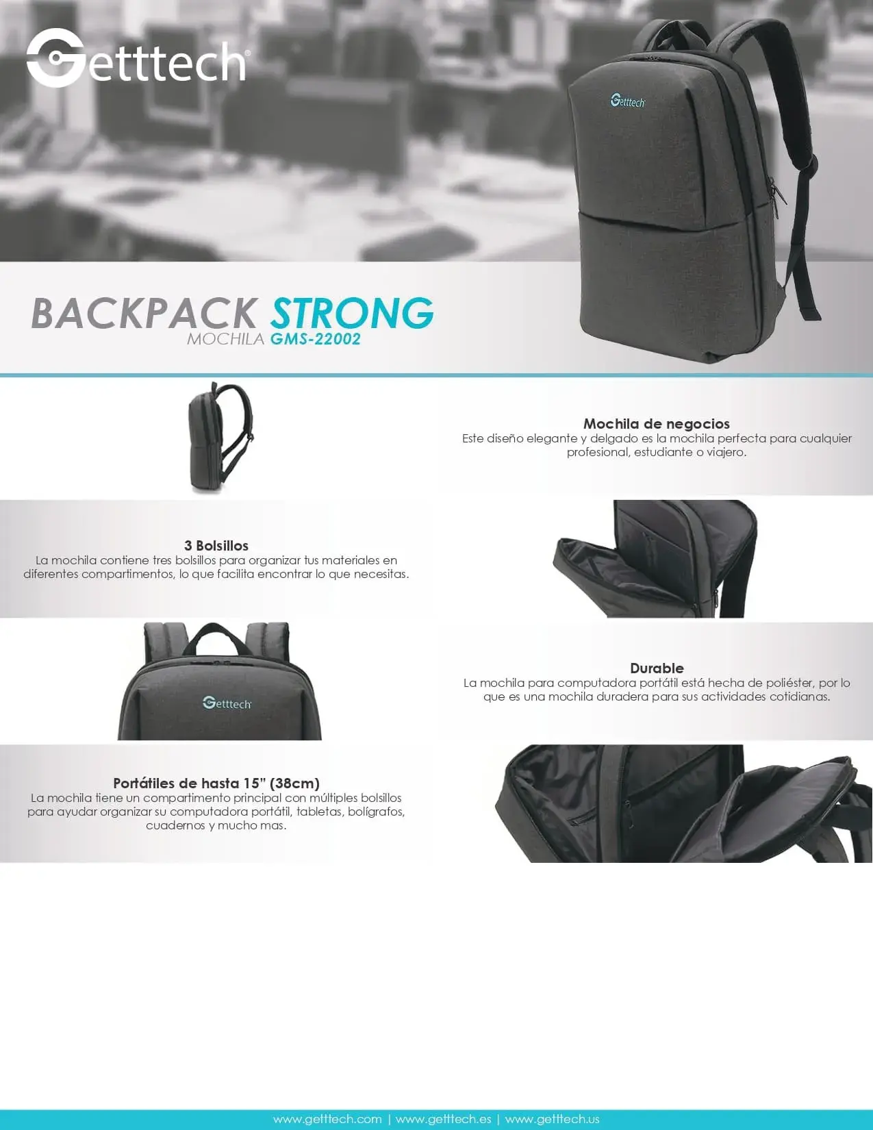 Mochila GETTTECH GMS-22002 / 15.6” / Resistente Al Agua / 3 Compartimentos / Gris oscuro
