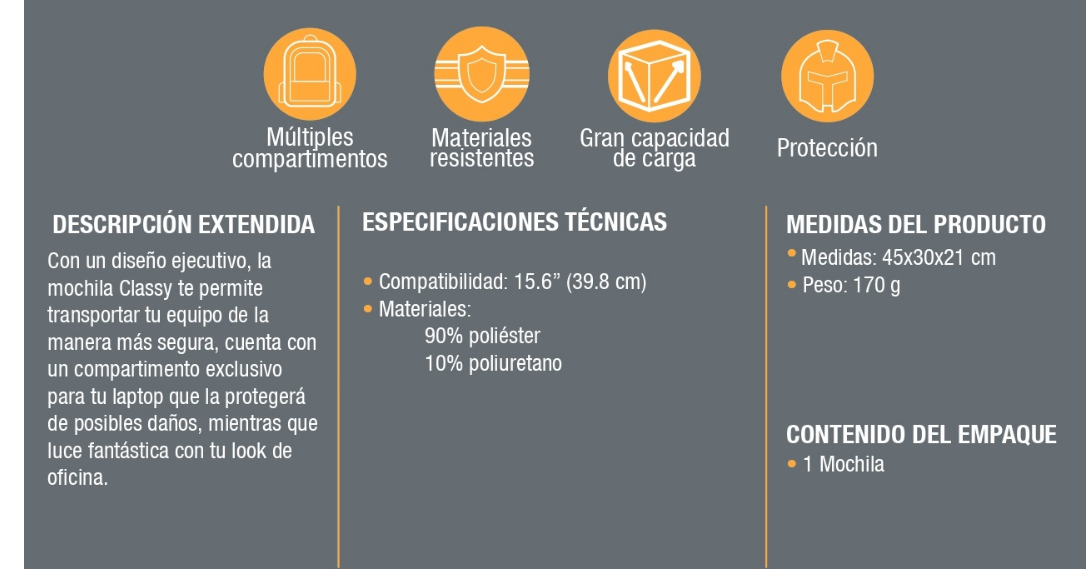 Con un diseño ejecutivo, la mochila Classy te permite transportar tu equipo de la manera más segura, cuenta con un compartimento exclusivo para tu laptop que protegerá de posibles daños, mientras que luce fantástica con tu look de oficina.