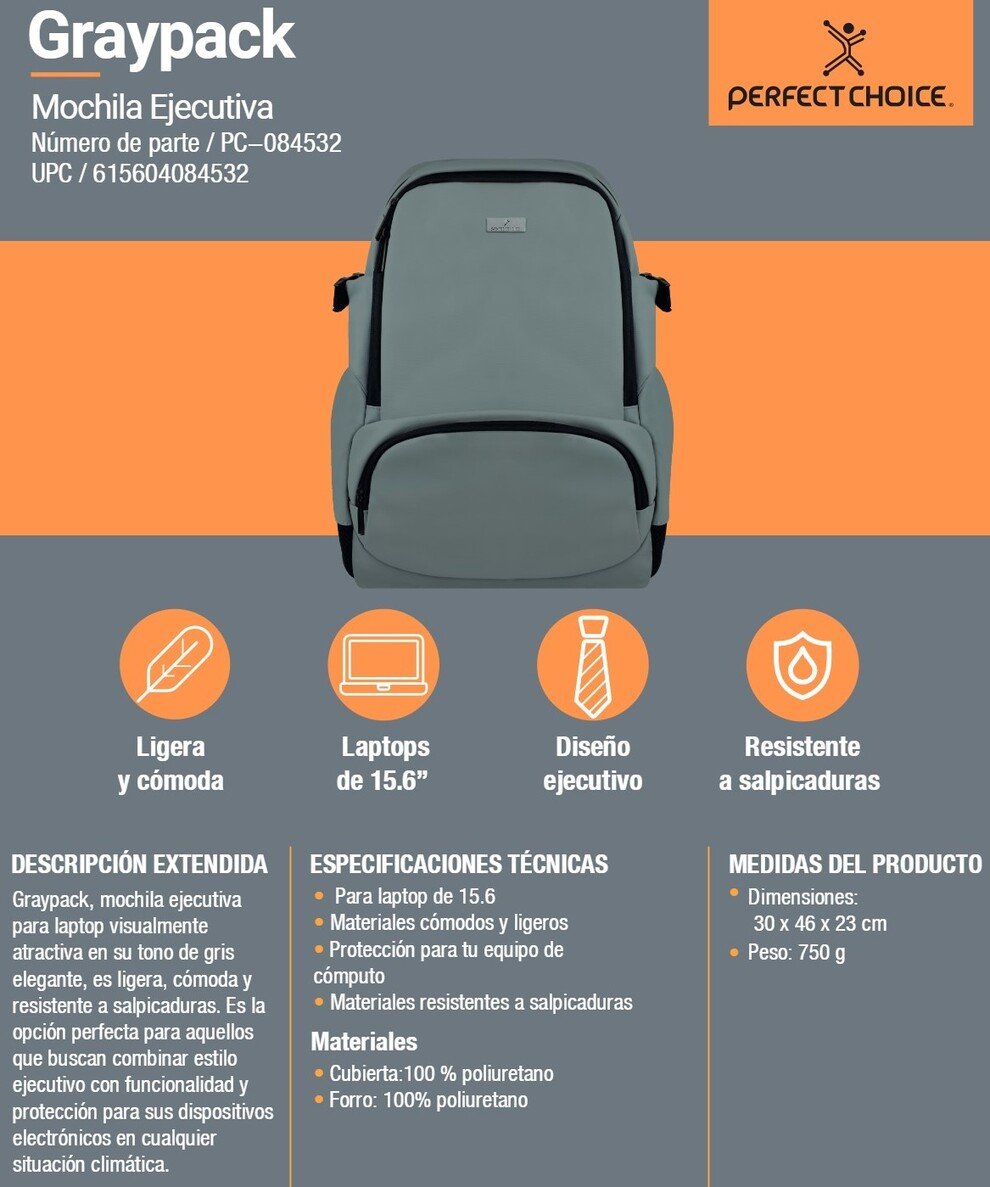 Mochila PERFECT CHOICE GRAYPACK / 15.6″ / Para Laptop, Viajes, Escuela, Ejecutiva / Poliéster / Ligera / Correas Acolchadas / Resistente A Salpicaduras / Color Gris