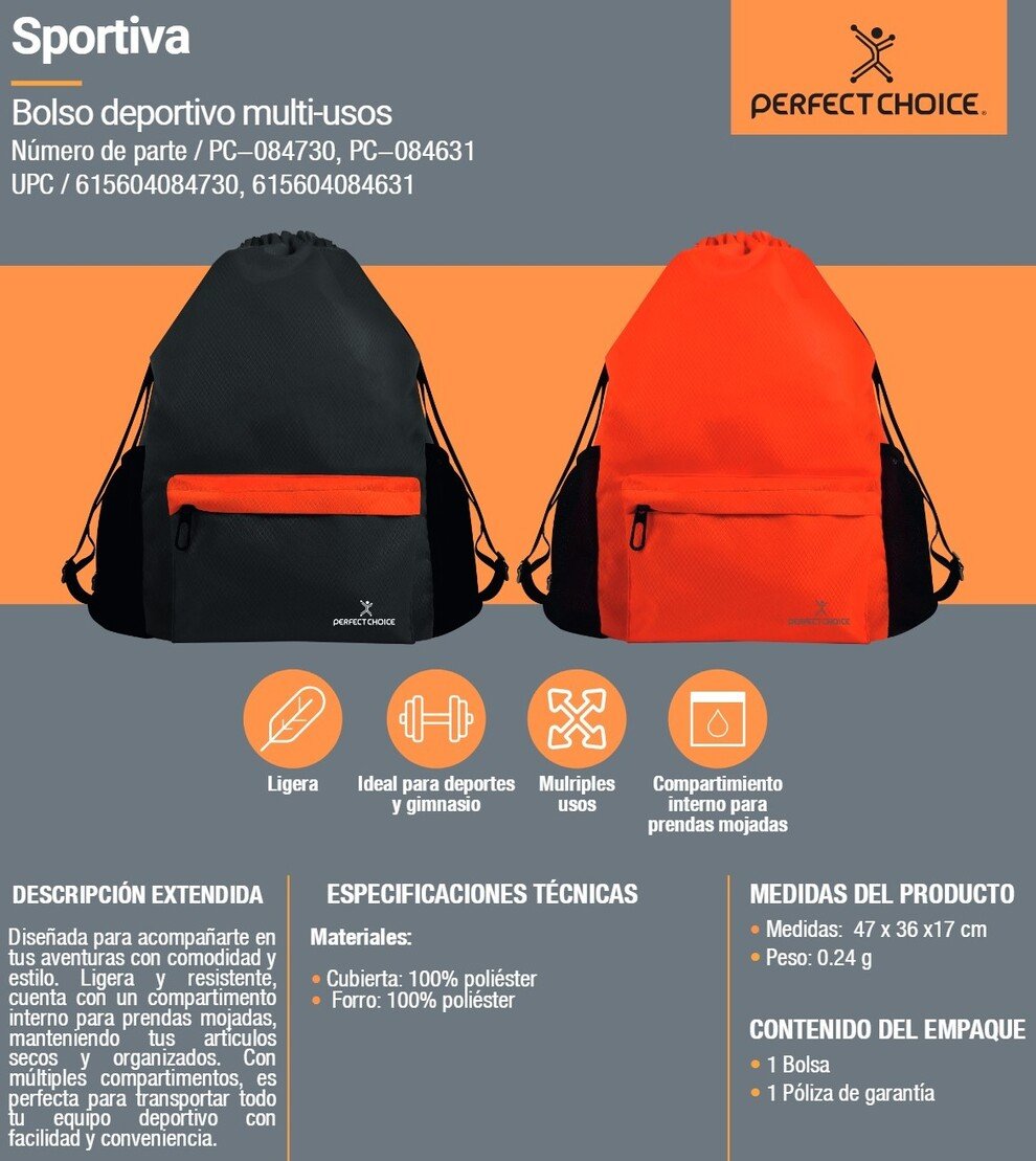 Mochila PERFECT CHOICE SPORTIVA / Multiusos Deportiva / Poliéster / Correas Acolchadas / Compartimiento Para Ropa Mojada / Ideal Para Gimnasio/Natación / Negro