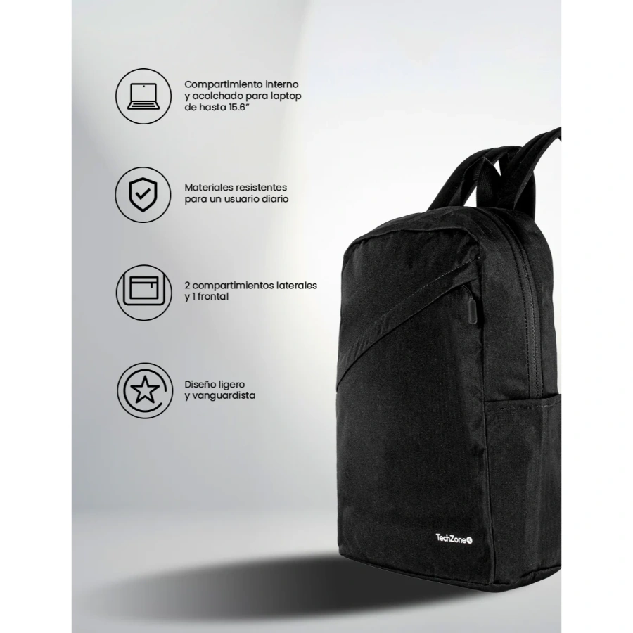 Mochila TECHZONE Classic Black / 15.6″ / Para Laptop, Viajes, Escuela / Poliéster / Bolsa Acolchada Para Laptop / Color Negro