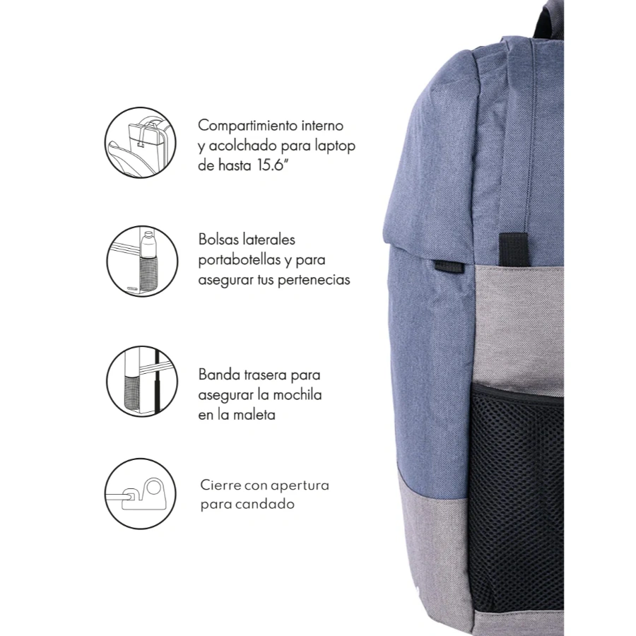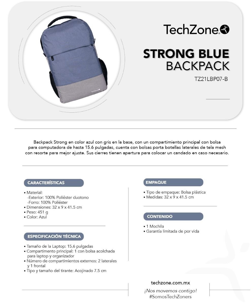 • Backpack Strong en color azul con gris en la base, con un compartimento principal con bolsa para computadora de hasta 15.6 pulgadas, cuenta con bolsas porta botellas laterales de tela mesh con resorte para mejor ajuste.