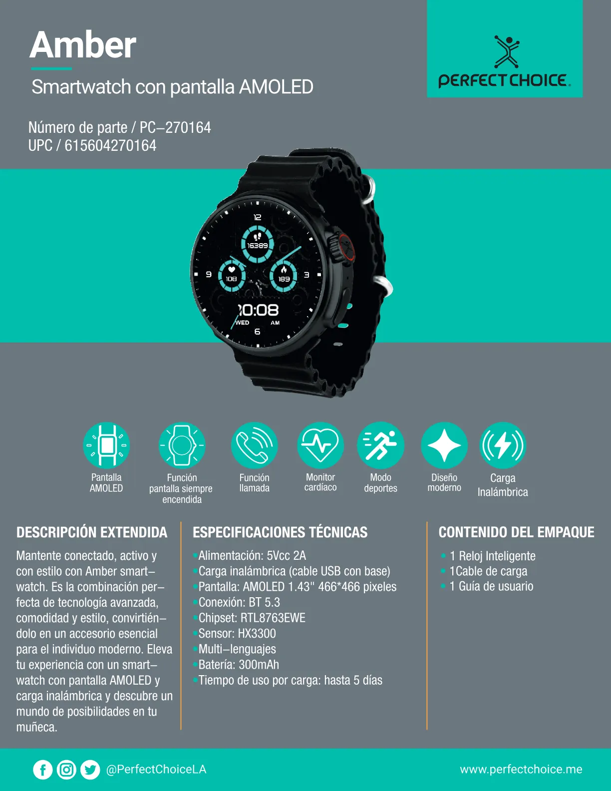 Reloj Inteligente Smartwatch PERFECT CHOICE AMBER / Pantalla Redonda Amoled / 1.43″ / 466x 466 Pixeles / Función Siempre Encendida, Llamadas, Ritmo Cardiaco, Modo Deportes, Carga Inalámbrica / Color Negro