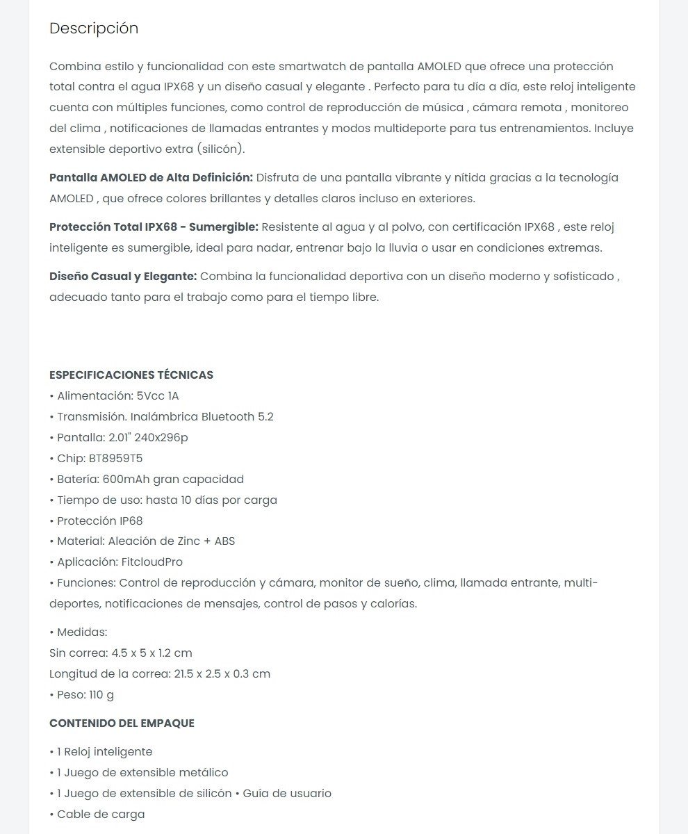 Combina estilo y funcionalidad con este smartwatch de pantalla AMOLED que ofrece una protección total contra el agua IPX68 y un diseño casual y elegante.