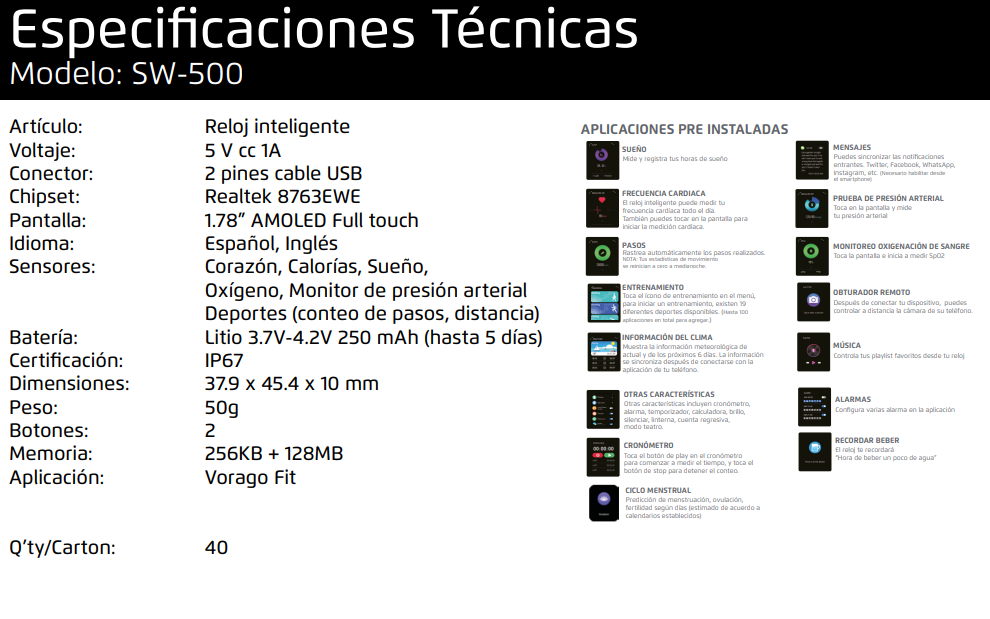 El Smart Watch SW-500 es la combinación perfecta de estilo y funcionalidad. Disfruta de las ventajas de integrar a tu vida diaria un reloj inteligente equipado con 256 KB de RAM y 128 MB de almacenamiento, que te permite tener acceso a tus aplicaciones favoritas en todo momento y al mismo tiempo cuidar tu salud.