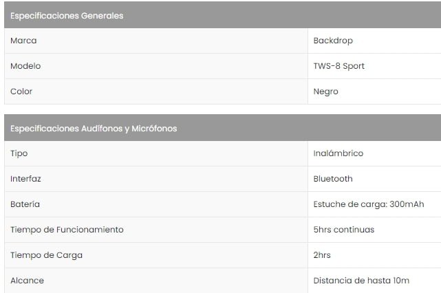 Audífonos BACKDROP TWS-8 Sport / Inalámbricos / Bluetooth / Manos Libres / Estuche De Carga / Color Negro